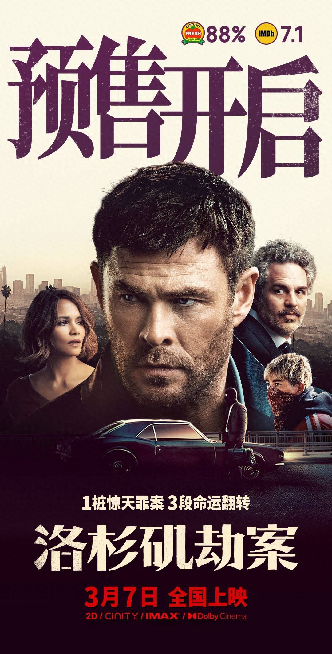 一场惊天劫案,三段命运翻转。电影《洛杉矶劫案》由巴特·莱顿导演,改编自《纽约时报》畅销书作家唐·温斯洛同名小说,克里斯・海姆斯沃斯、马克・鲁法洛、哈莉・贝瑞、巴里・基奥恩领衔主演。3月7日下周六全国影院上映,预售现已火爆开启,大银幕见证这场猎捕游戏的终极对决!